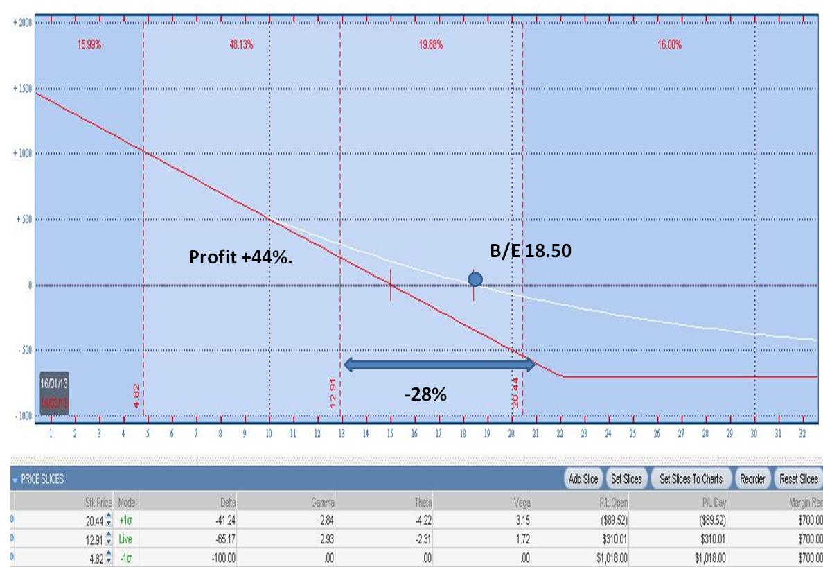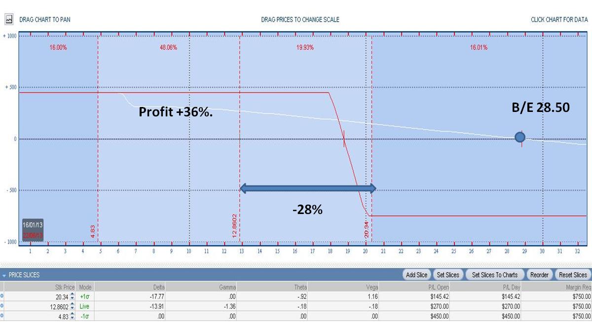La primera imagen corresponde a una Long Put (opción simple a débito) y la segunda a una Bear Put (Vertical bajista a débito). Estas dos operaciones cumplen una expectativa bajista. La primera presenta unas beneficios del 44% y la segunda del 36%. Para que la long put tenga más beneficio que la Bear Put ha sido necesario que el precio baje un 28% en menos de 2 meses. Si analizamos el punto de Break –Even (punto de ganancia/pérdida cero) se pueden ver grandes diferencias. La long put tiene un BE en 18.50 y la Bear Put en 28.5; es decir ante un hipotético repunte del subyacente estamos mejor cubiertos con la Bear Put. Es un buen ejemplo para comprobar la diferencia entre operar opciones long y verticales, y para que se entienda que el trading direccional con spread de opciones es más eficiente que la compra de opciones simples.
