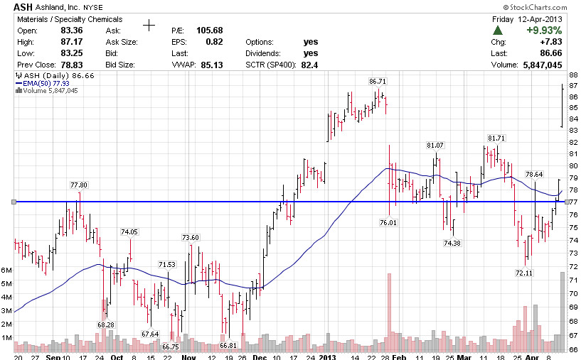 Tenemos la acción de ticker ASH. Si vemos el gráfico, el gap se inicia sobre los $79, EMA50 en $78 y último mínimo relevante en $72
