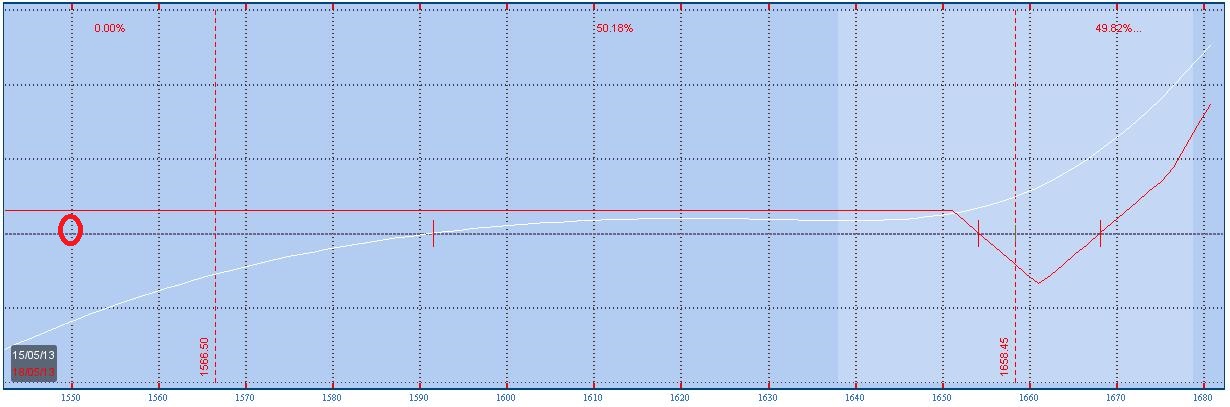 La imagen que te muestro es el gráfico de riesgo de la trend iron condor del vencimiento del mes de mayo sobre el SPX durante la sesión de ayer miércoles. La dificultad de esta posición ha venido del mal entorno de volatilidad ya comentado y del desplazamiento del precio de esos 100 puntos aproximadamente. Con un círculo rojo se representa dónde estaba el precio en el momento de abrir la estrategia. Por suerte el movimiento de ayer casi hasta los 1660 nos benefició.