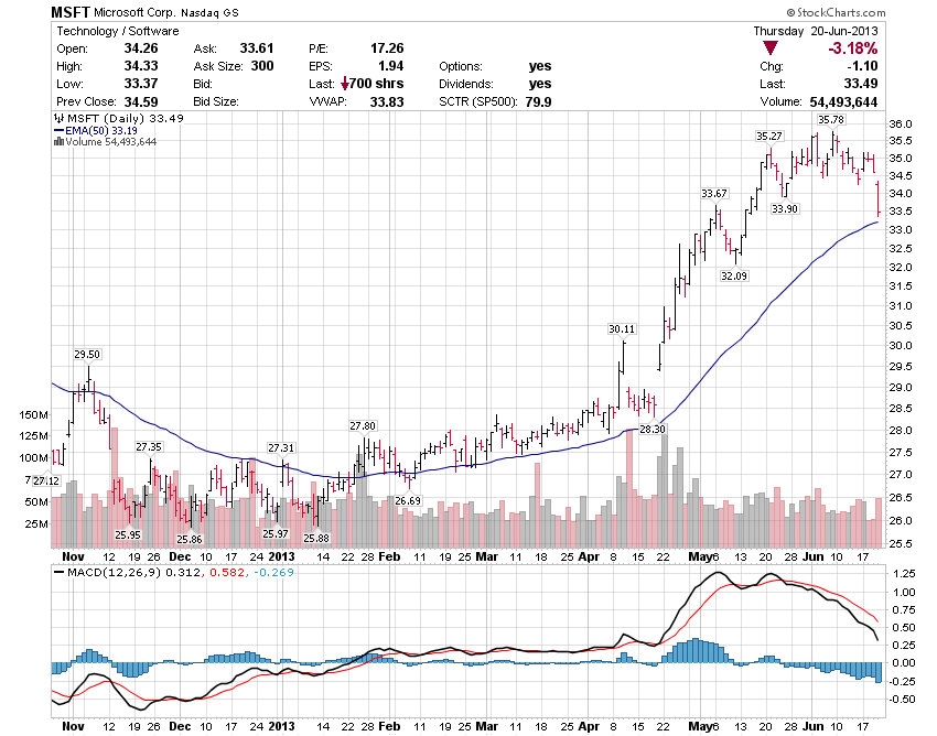 Seguimos con la misma filosofía, esta vez sobre Microsoft. MSFT cerraba ayer en $33.49. Su tendencia actual es Lateral-Alcista.