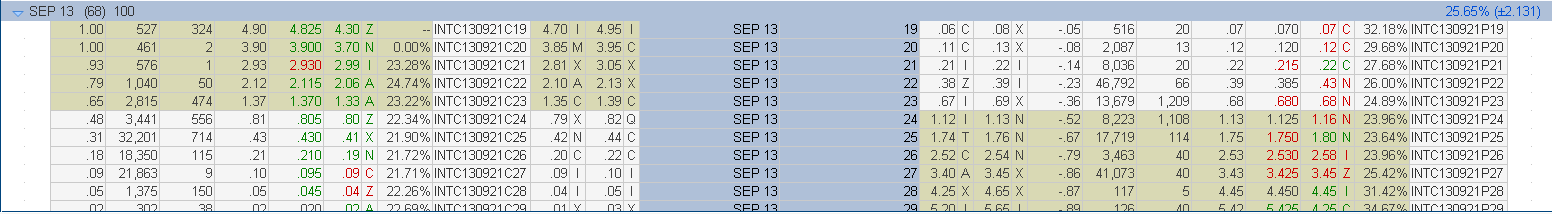 Partimos de una posición muy básica. Una long call con 68 días a vencimiento ATM, nuestra expectativa es que el precio suba. Actualmente el precio está en 23.90, (he tomado INTC como ejemplo). Aquí podemos ver la cadena de opciones: