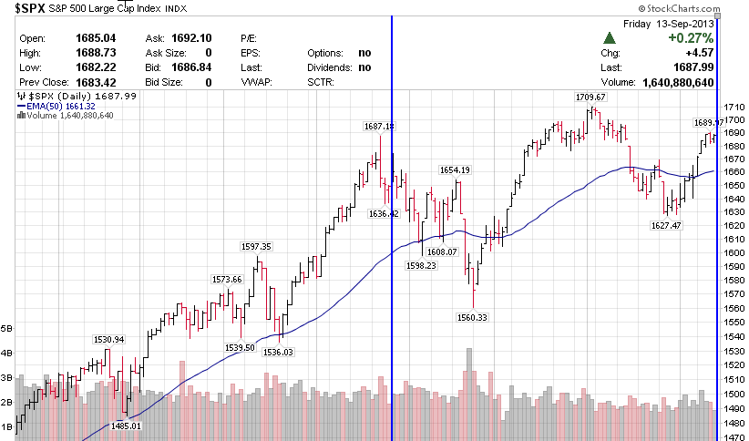 Veamos un gráfico del S&P500 para analizar el tiempo de mercado con el que hemos estado trabajando, periodo que ha ido desde el 26 de Mayo hasta ayer 13 de Septiembre: