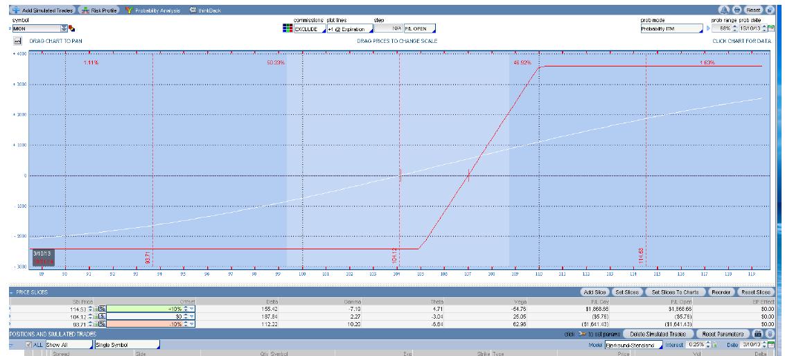 El gráfico de riesgo de la estrategia objeto de estudio es la vertical:Bull Call JAN14 105 110, con MON como subyacente:
