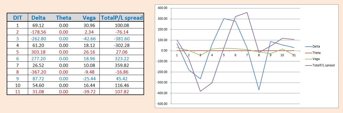 En los 11 primeros días del trade (Days In Trade), la estrategia se comportó como se muestra en la siguiente imagen. En ella, se puede ver cómo se fabrica cada dólar de beneficio o pérdida por cada una de las principales griegas que intervienen en la valoración de las opciones: Delta (exposición al movimiento del precio), Vega (exposición a la volatilidad) y Theta (exposición al paso del tiempo). Por ejemplo, el día 4 hizo $61.20 por delta, $0 por theta y $18.12 por vega, que acumludos estos valores al beneficio/pérdida de los días anteriores dio como resultado $ -302.28 de pérdida.