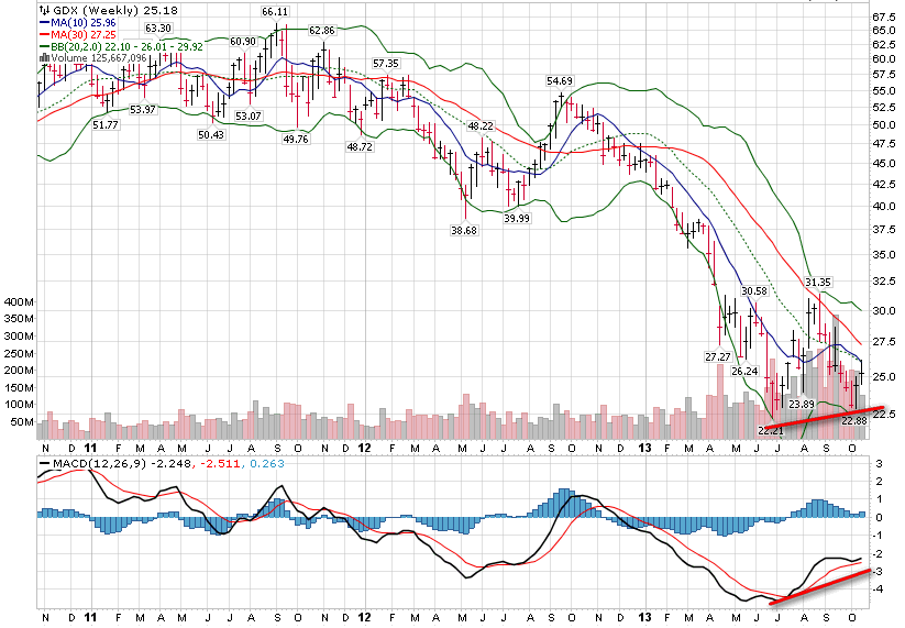 Para empezar, vamos a ver una excelente oportunidad de inversión en el sector oro y mineras. Vemos en primer lugar un gráfico de GDX, el cual muestra divergencias y la posible formación de un suelo. Creo que este sector ha sido castigado muy duramente y está próximo a un rebote importante: