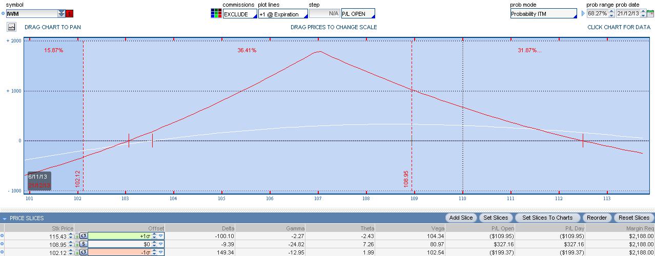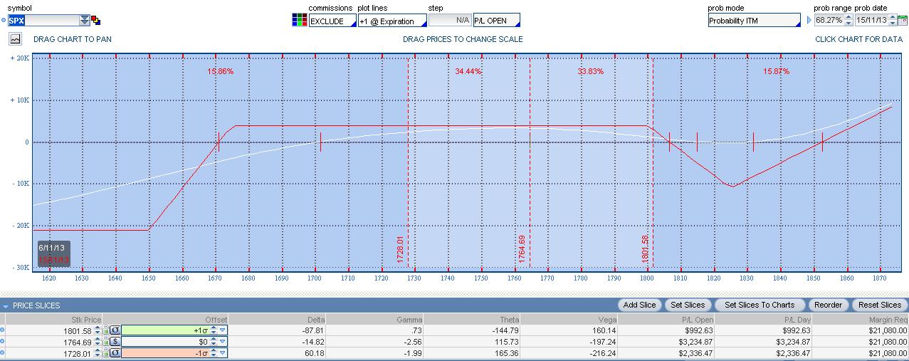 La primera es una Trend Iron Condor (TIC) de expiración de Noviembre 2013 sobre el SP500 (SPX) que ya está cerrada con un buen resultado. En la siguiente imagen te muestro la posición, tal y como estaría ahora. El beneficio que hemos recogido es inferior al que aparece en la imagen, pero ha sido alto (por encima del 5% en cuenta). Ha sido una expiración no muy difícil y en la que la clave ha sido la ganancia de crédito por ajustes en el último impulso alcista del índice.