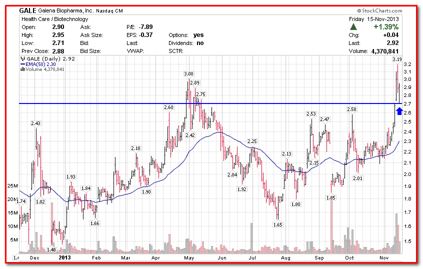 Por ejemplo, GALE presenta a cierre de viernes una entrada muy interesante, sobre los $2.80, con stop en $2.70 (a cierre de día):