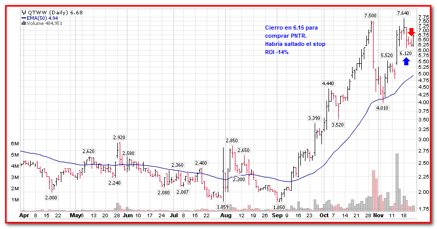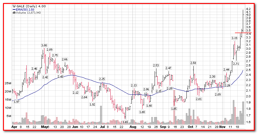 La semana pasada, en el post anterior, veíamos una entrada en GALE sobre los $2.80. Al cierre de ayer, la posición se había revalorizado un 42% en una semana... no está mal.