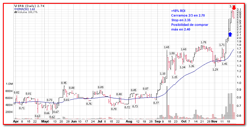 Ýa podemos subir el stop sobre los 3.50, lo que nos garantiza un beneficio del 25%. Si la semana próxima continúa subiendo, la zona de los $5 sería buen punto para vender 2/3.