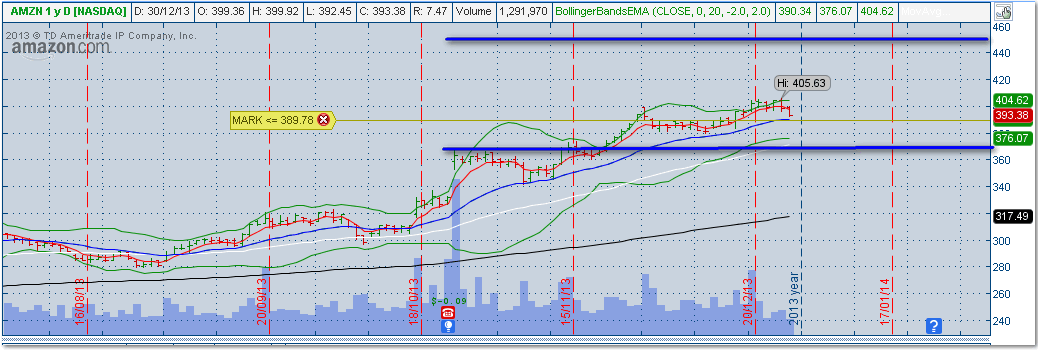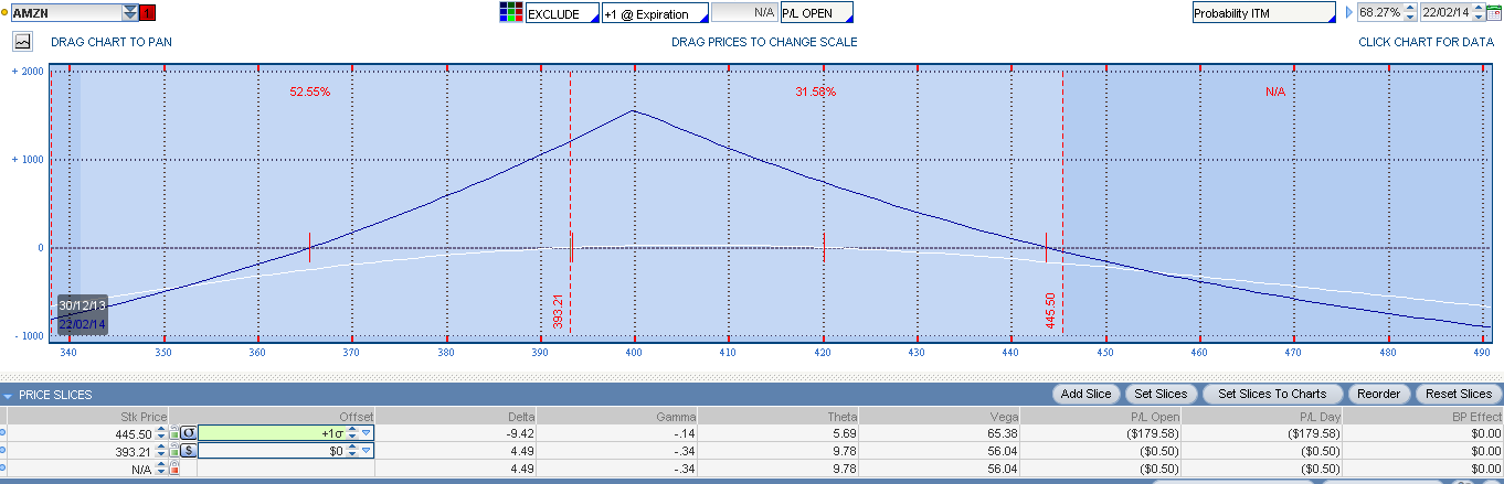 Sin embargo, hay un mundo amplio de acciones de las cuales también podemos sacar ventaja con este tipo de operativa. Por ejemplo, vamos a ver una estrategia sobre Amazon (AMZN). Se trataría de una Calendar Spread OTM: LC JUL 400 + SC FEB 400 ($16.30)