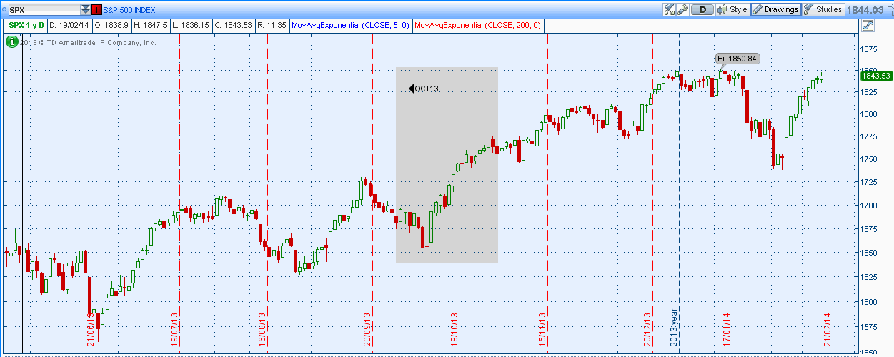 El mes alcista elegido es el mes de octubre del 2013 con una subida del 4.45% para el SP500 (y del 4.46% para el SPY), y que podemos clasificar como alcista ya que es superior al 3%. Las características de este mes son subida de precios (interesa delta positivo), caída de volatilidad implícita de las opciones (interesa vega negativo) y tienes 23 sesiones (interesa theta positivo).