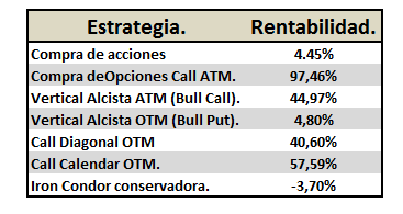 Las estrategias que he elegido son, además de la compra directa de la acciones, estrategias típicas de opciones para poder compararlas. Ya sabemos que el mes es alcista y son estrategias que se deben adaptar en cierta manera a ese movimiento (excepción de la calendar y de la iron condor que normalmente necesitarían ajustes). La compra de futuros con apalancamiento de x10, o de CFDs no se ha tenido en cuanta en el artículo. Con opciones se puede obtener apalancamientos x70, pero se intenta comparar estrategias más que buscar rentabilidades astronómicas.
