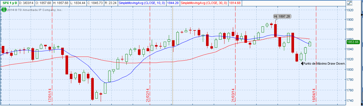 En la siguiente imagen se puede ver el nivel de máximo retroceso del índice. Ya que el SP500 no se puede comprar ni vender, estamos operando en el ETF que lo replica, el SPY.