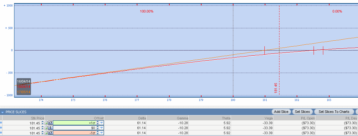 Con el sistema de collar trade dinámica y para ese nivel de máximo nivel de pérdida, lo puedes ver en el siguiente gráfico (P/L Day $73.30):