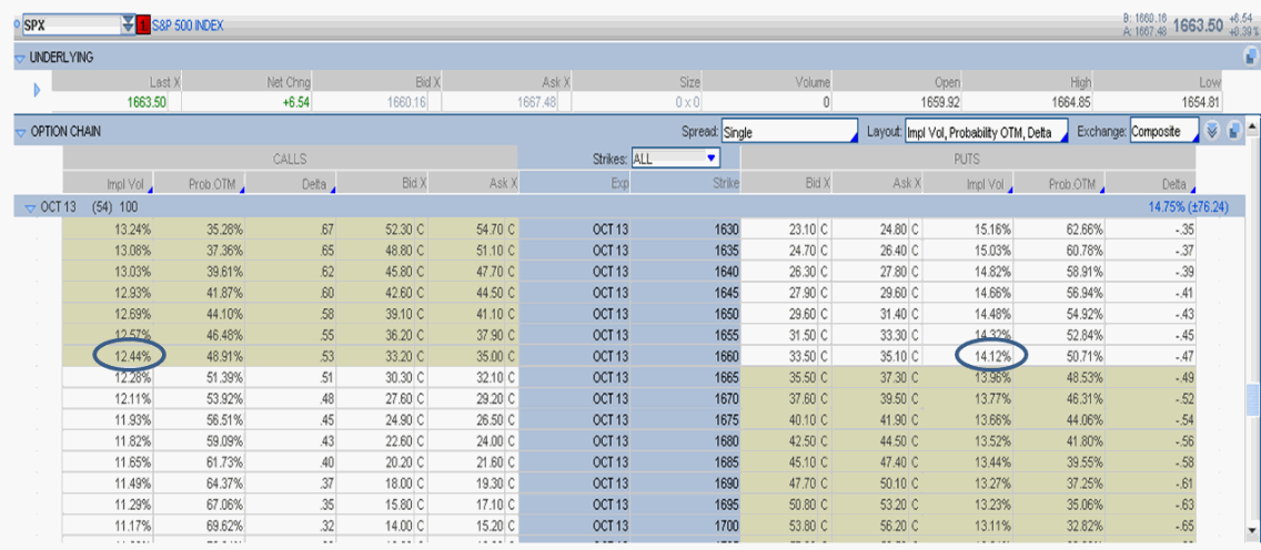 En la siguiente imagen se presenta la cadena de opciones del índice SP500 para el vencimiento de octubre 2013. Un strike próximo a la cotización actual del precio, es 1660. Los strikes próximos a la cotización del precio se les llama strikes a dinero (ATM, at the money) Para este strike la IV en el lado call es 12.44% y para el strike de las puts es 14.12%.