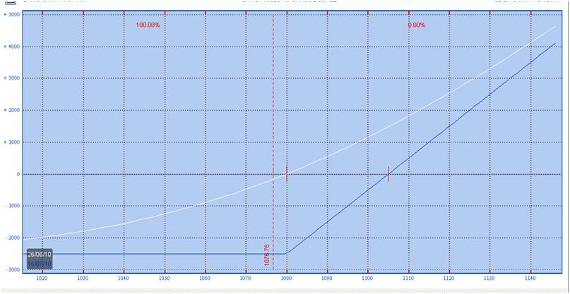 La mejor manera de entender una operación es a través de su gráfico de riesgo. A continuación podemos ver el gráfico de riesgo de una Long Call JUL 1080 sobre el índice SP500