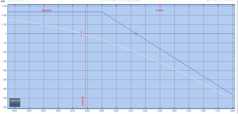 Para entenderlo mejor, vamos a ver el gráfico de riesgo/beneficio de una Short Call. A continuación podemos ver el gráfico para una Short Call AUG 1090 sobre el índice SP500
