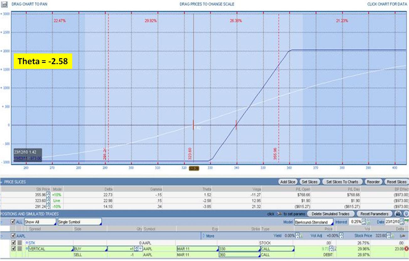 Pero el time decay no sólo afecta a las opciones, sino también a los spreads, que al fin y al cabo son combinaciones entre opciones. Para saber cómo afecta el time decay a una estrategia en particular, debemos fijarnos en su letra griega “theta”: