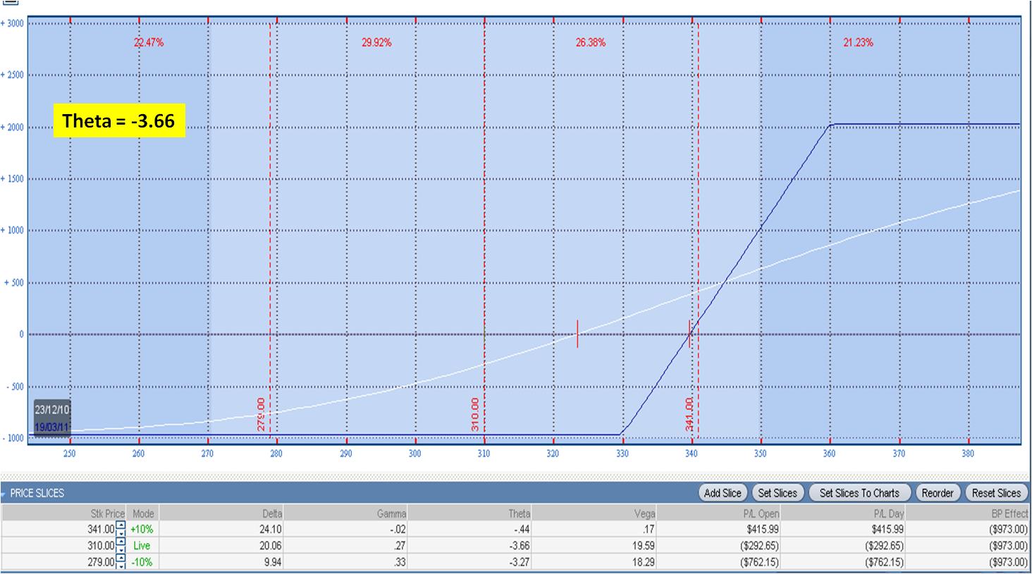 En el caso de que el precio baje de $323 a $310, haciendo una simulación, vemos cómo theta varía a -3.66. Sigue siendo negativa, lo que significa que nuestra operación sigue perdiendo según pasan los días. En este caso, $3.66/día.