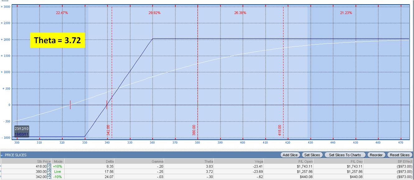 Si observamos detenidamente los gráficos, vemos que cuando el precio se encuentra dentro del gráfico de riesgo en la expiración (línea azul), theta es positiva, mientras que cuando el precio está fuera (en nuestro ejemplo por debajo de $340), theta es negativa.