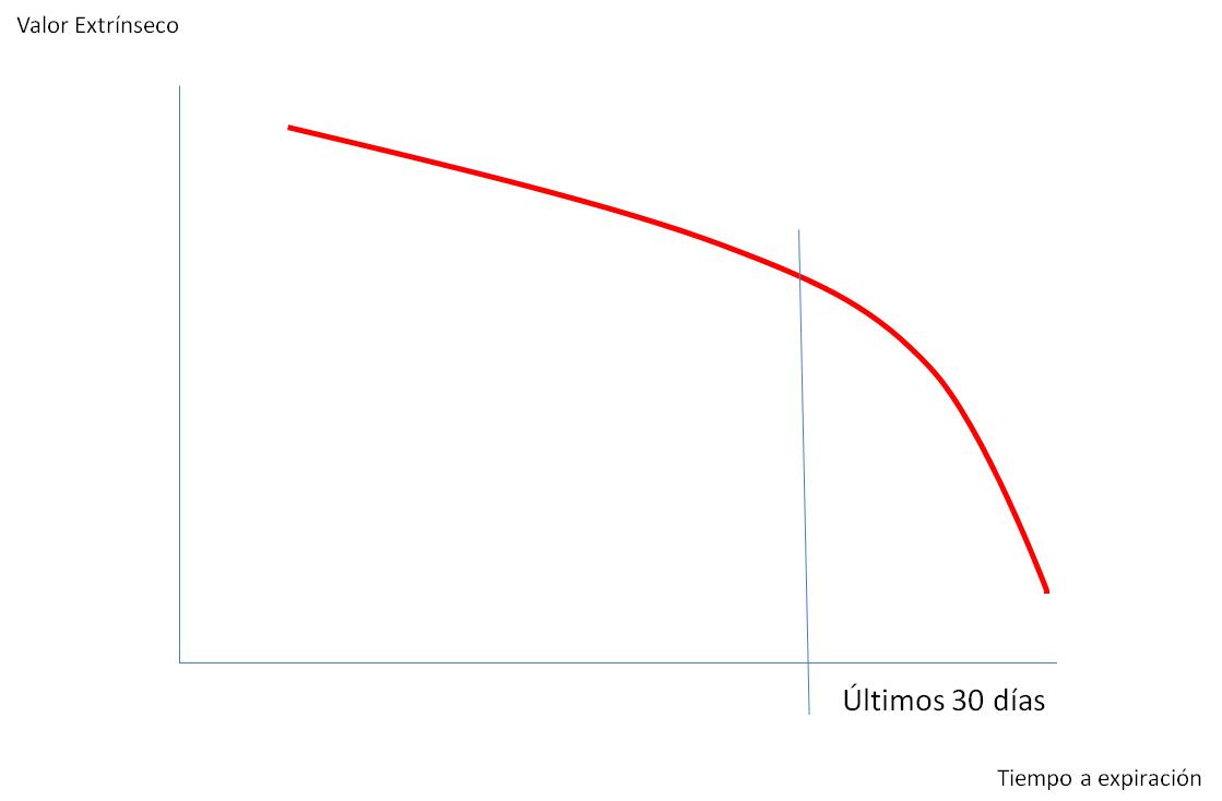 En el siguiente gráfico podemos ver cómo el time decay se acelera en los últimos 30 días antes de la fecha de expiración: