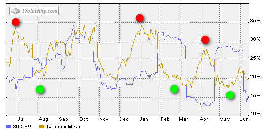 En la siguiente imagen observamos un gráfico de volatilidad de Apple (AAPL), cortesía de ivolatility.com. En rojo hemos puesto los escenarios de volatilidad altos, es decir, favorables para la venta de volatilidad, mientras que en verde tendríamos los escenarios de volatilidad bajos y favorables para la compra de volatilidad:
