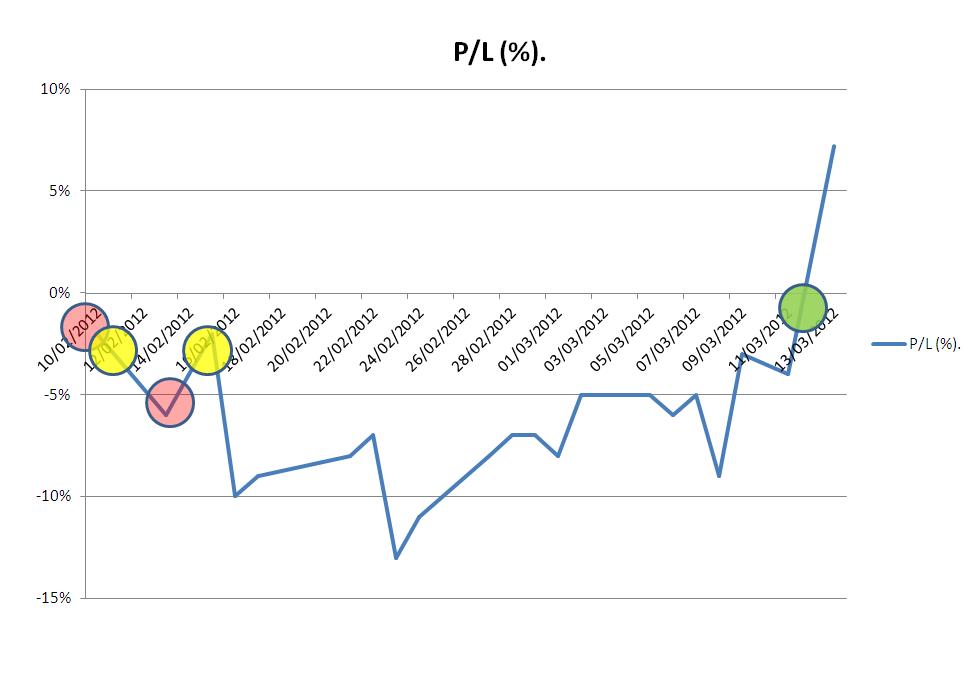 La siguiente imagen representa de forma gráfica el poder de los ajustes. Una operación que desde el inicio fue mal. Sin ajustes, habríamos cerrado asumiendo una pérdida. En cambio, los ajustes (puntos rojo y amarillos) mantuvieron la estrategia con el riesgo controlado hasta que pudimos cerrarla con beneficio (después del punto verde):