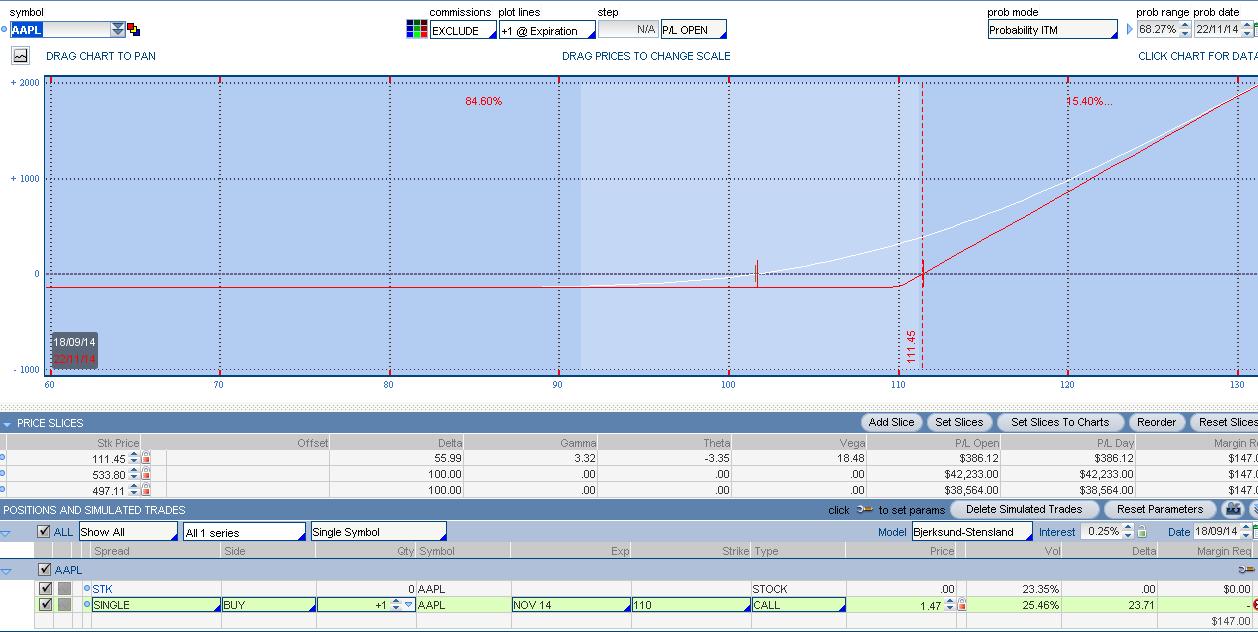Long Call AAPL Strike 110 y expiración de Noviembre 14, con coste base $147:
