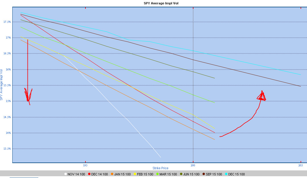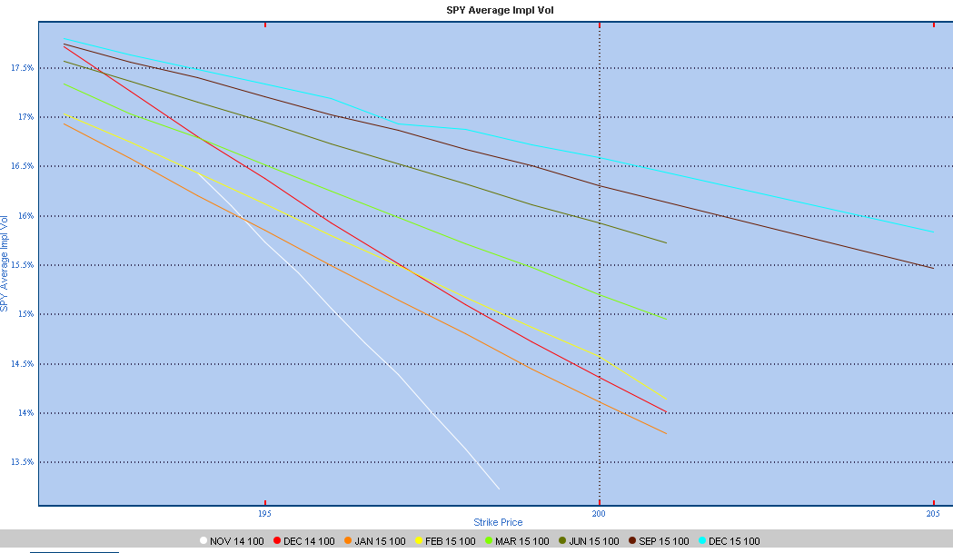 Vamos a empezar viendo cuál es la situación actual de volatilidad en el SPY. En la siguiente imagen vemos el skew de volatilidad implícita en las diferentes expiraciones: