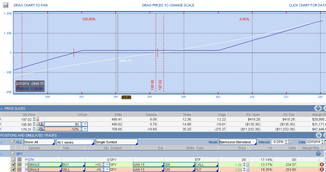 Vemos que se trata de una estrategia alcista (delta positivo). Esta operación trabajaría bien un movimiento del SPY Lateral-Alcista (por encima de los 185 puntos), le beneficia el paso del tiempo (theta positivo), y además se beneficia de la caída de volatilidad (Vega negativo), que es precisamente lo que estamos persiguiendo con el análisis del skew.