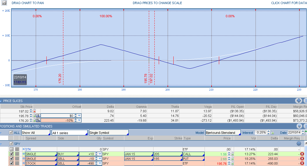 Alguien podría decir, "sí, pero no tengo tanto capital para hacer este tipo de gestión". Bien!!, pues en lugar de ponernos cortos en el SPY, hagamos una posición sintética con opciones.