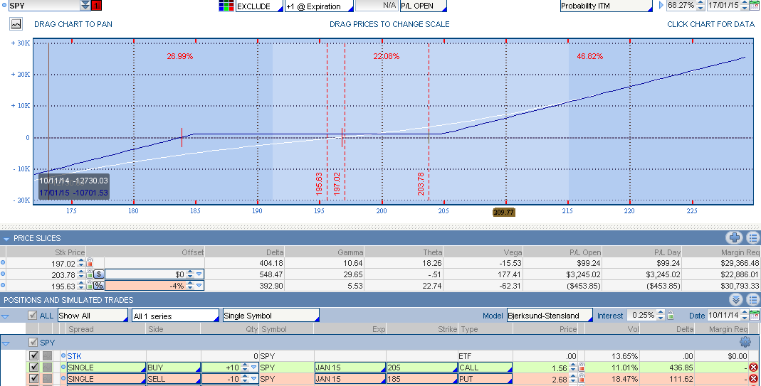 En la siguiente imagen observamos la situación de la estrategia direccional que planteábamos, actualmente con un beneficio del 14% sobre margen: