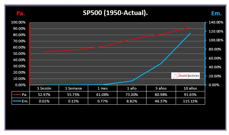 Para calcularlo me he cogido un índice, el SP500, no una acción que está sujeta a la publicación periódica de beneficios y los diferentes eventos que puedan mover su cotización. El número de acciones que obtienen una rentabilidad inferior a los índices, es superior que el número de acciones que obtienen una rentabilidad superior. Luego, en un índice te aseguras que aunque nunca pegarás un pelotazo y que aunque puedas sufirir correcciones, al final los índices se acaban recuperando.