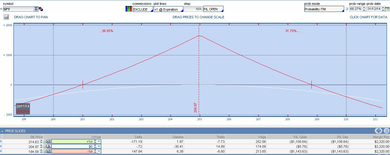 1.- Una calendar a dinero, se podría aprovechar del rango lateral. La volatilidad tanto si se incrementa o disminuye en los rangos anteriormente mencionados, es poco probable que fuera decisiva en la estrategia. Se trata de la Call Calendar 205 Dec15 Feb15. Por su puesto que una calendar de este tipo no cubre el rango 195-205 por ser demasiado amplio.