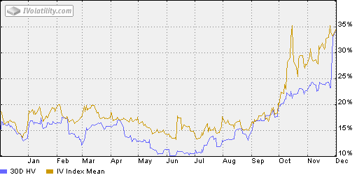 También hay que tener en cuenta que la volatilidad en las materias primas se mueve de forma diferente a las acciones. Si USO se mueve lateral-alcista en los próximos 3 meses, su volatilidad tenderá a caer. En la siguiente imagen vemos el gráfico de volatilidad de USO:
