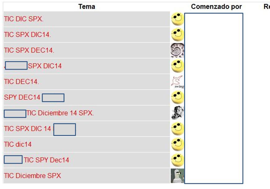 Si nos centramos en la expiración de diciembre 2014, que ya está terminando, hemos tenido muchas estrategias abiertas (imagen inferior) y muy diferentes unas de otras. En cada una de ellas se puede ver las condiciones de apertura, la gestión de la posición con sus ajustes y los cierres. Esta actividad de subir estrategias a los foros, mes tras mes, hace que tu curva de aprendizaje se eleve muy rápidamente. Vivir muchas experiencias en la operativa, ya sean tuyas o las de otros compañeros acaba afinando tus estrategias. La expiración de diciembre no está siendo fácil. Casi todos hemos abierto en la fase de impulso del precio. Por ejemplo, los que han abierto en el SPX, el movimiento entre 1820 y 2080 ha sido más fuerte que la bajada de volatilidad que ha acompañado, razón por la que las estrategias han sufrido. Y ahora ya casi metidos en la semana de expiración estamos corrigiendo.