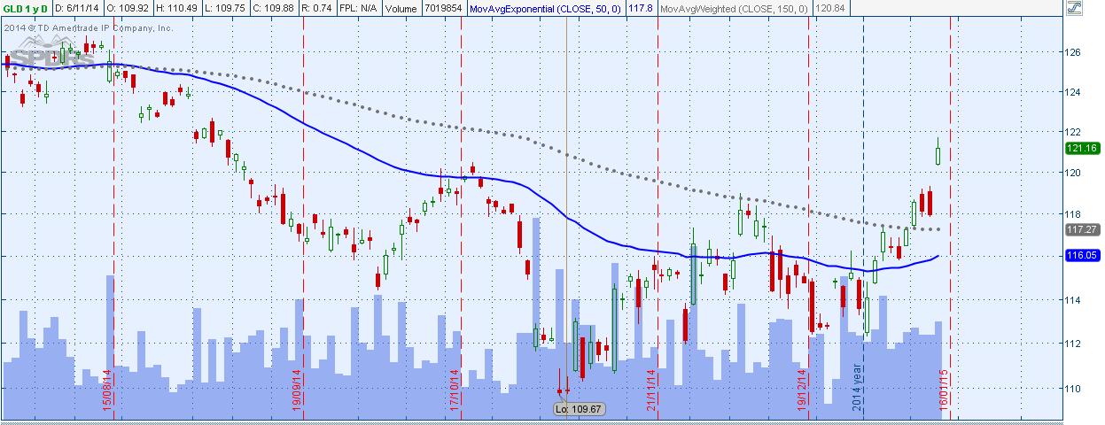 Hace casi dos años analizamos en este blog el oro y cómo su tendencia alcista llegaba a su fin. Si nos centramos en el ETF GLD, vemos que desde sus máximos a cierre de mes de agosto de 2011 en 177.69, hasta los mínimos en 112.11 en noviembre de 2014, el retroceso ha sido muy fuerte, un retroceso del 37%.. Tres años que no ha levantado cabeza.
