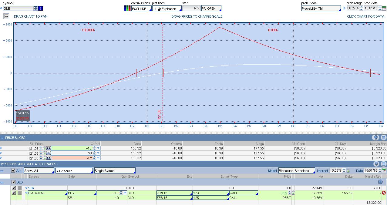 No es uno de mis subyacentes favoritos, por esos movimientos esporádicos tan fuertes, pero si tuviera que plantear una estrategia sí o sí, con la que tuviera el máximo de posibiidades de salir en beneficio, elegiría sin dudarlo una diagonal, concretamente una Call diagonal. Esperaría unos días para ver donde acaba el movimiento de hoy (+2.60%), y plantearía una diagonal similar a esta: Call Diagonal Jun Feb 123 125. Hacia arriba no hay problema y siempre tendremos beneficios. Hacia abajo, es necesario elegir un buen punto de ajuste para que la estrategia no entre en pérdidas. Se podría buscar un beneficio por encima del 20% en el mes, pero ojo con el control de las pérdidas en este subyacente, ya que se pueden disparar si dejamos correr al precio.