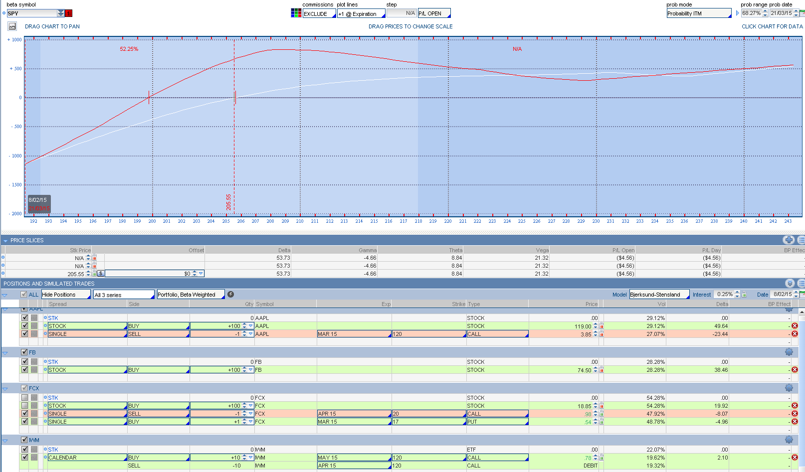 Ahora necesitamos una variable más: Delta que nos indica lo que varía la prima de la opción ante los movimientos del subyacente.Supongamos esta cartera compuesta por: 100 AAPL, 100 FB, 100 TWTR, 100 HAL, 100 XOM, 100 CVX, tendremos deltas de distintas acciones. Suman 600 deltas pero un movimiento de 1$ en AAPL no podría ser secundado por el resto. La delta de una acción con más beta representará más riesgo que una con bajo beta para nuestro portfolio. Por lo tanto para conocer nuestro Delta Risk previamente tenemos que convertir los Deltas individuales con lo que se denomina Beta Weighted Delta, normalizamos el riesgo de diferentes posiciones para visualizar el riesgo teórico de nuestro portfolio.