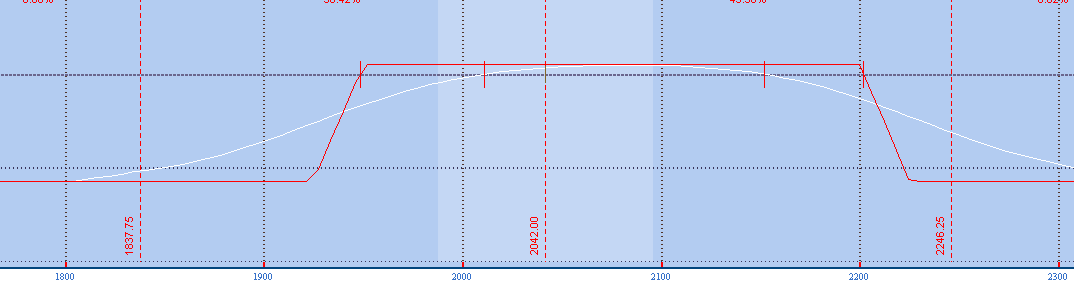 Imagínate que tienes la posición que te muestro en la siguiente imagen. Es una posición sobre el SPX. No es una posición real, ni el beneficio, ni el margen, ni sus relaciones, y no merece la pena que intentes hacer cuentas con ella. El máximo beneficio anda por los $1100, la máxima pérdida por los $11.000 y en esa imagen el beneficio rondaba los $750. La zona azul clara marca una desviación estandar a la fecha de expiración, o en otras palabras, quiere decir que existe casi un 70% de probabilidad de que en la fecha de expiración el precio se encuentre en esa zona azul clara.
