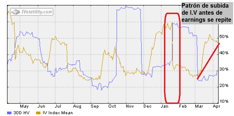 Netflix el trimestre anterior protagonizó lo que se conoce como Crush de Volatilidad tras el anuncio, también acompañado por una espectacular variación en el precio. Vemos como se va cargando de volatilidad el subyacente para después relajarse: