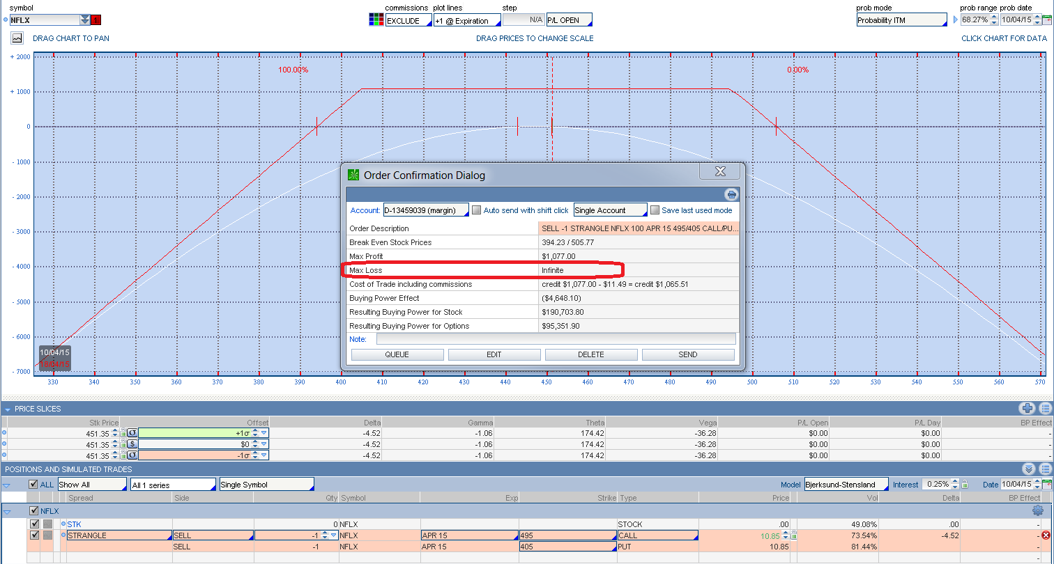 Como estamos muy cerca de la fecha, vamos a probar como se comportaría una estrategia que aproveche ese Crush Volatility, una short strangle a una distancia de +/-45$ del precio actual, en la imagen coloco nuestro máximo riesgo: infinito (por el lado Call) en este tipo de estrategias naked.