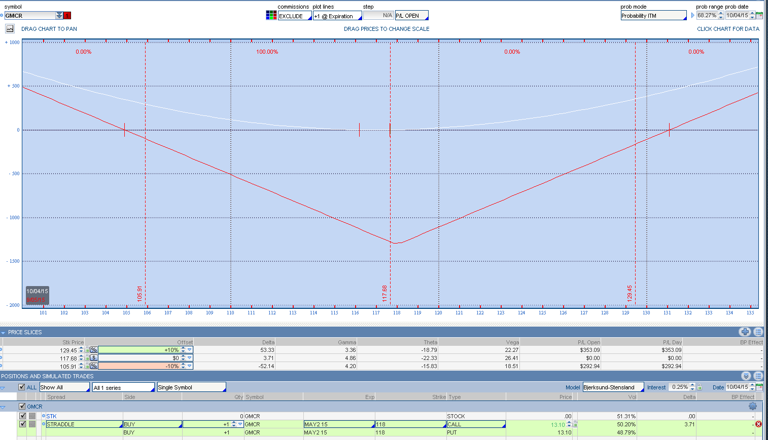Y para mayo vamos a dejar propuesta otra sobre Keuring Green Mountain (GMCR), pues queda tiempo para sus earnings que son el 7 de mayo del 2015 y en este caso espero comprobar como le influirá a la estrategia el previsible aumento de volatilidad que le queda hasta ese día.