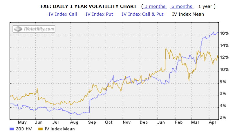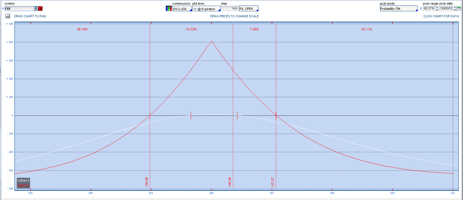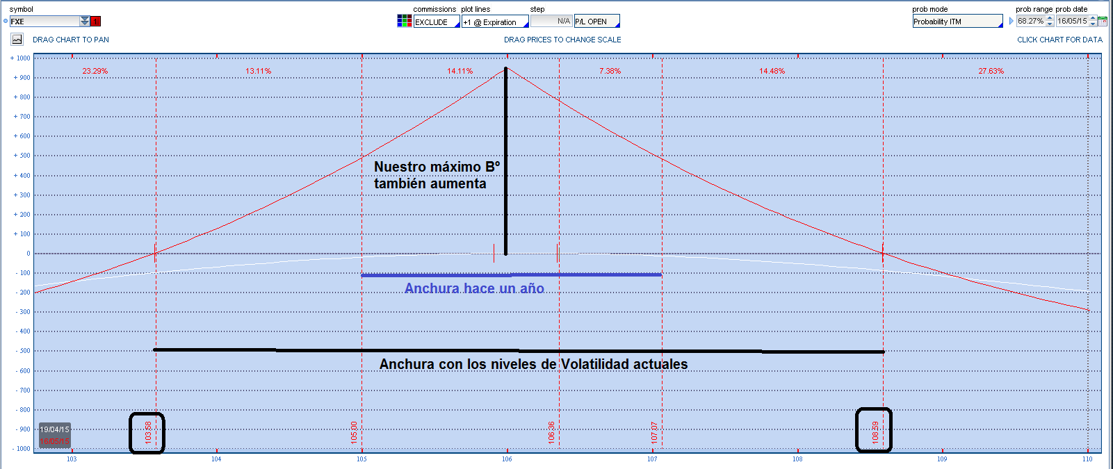 Es una divisa y normalmente no tienen estos niveles de volatidad. Imaginaros la IV del SPX multiplicada por 3, estaríamos en niveles del Sell Off de Octubre. En lo que va de año la IV se está consolidando en los entornos del 12%. Quizás estamos ante una nueva etapa de niveles de volatilidad y lo que antes veíamos como elevado ahora sea normal. Esto a la hora de operar con opciones es vital controlarlo pues la IV es dinero. A mayor IV mayores primas. Si habéis operado el FXE (etf sobre euro/dolar) con opciones y en concreto con calendar habréis experimentado el impacto de esta nueva situación. He planteado una Put Calendar 106 de Mayo-Junio 2015, a precios de hoy y la misma con precios en función de la volatilidad implícita que tenían los strikes seleccionados hace un año, para esta simulación me valgo de una calculadora de opciones.