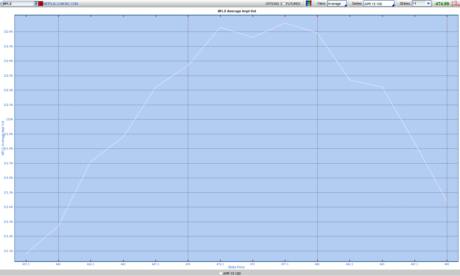 PD: La operación sobre NFLX planteada hubiera terminado en expiración con unas pérdidas de 64.000$ (sin ajuste alguno). Como curiosidad observad el skew de volatilidad que presentaba el vencimiento de Abril la tarde del miércoles 15 antes del anuncio de los earnings tras el cierre. Todo el mundo comprando los straddles y vendiendo short strangles.