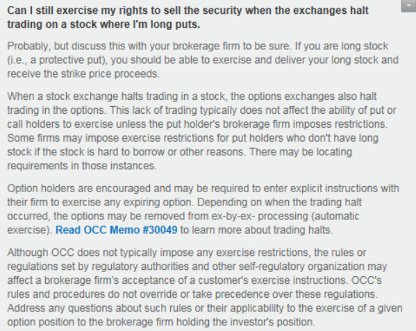 La entrega y liquidación de las opciones están garantizadas por la OCC (Options Clearing Corporation), en el caso de las puts si decides ejercer el derecho estarás corto al strike de acciones de la empresa. Luego habrá que cerrar la posición comprando esas acciones que están suspendidas. En general nos podríamos encontrar con dos situaciones antes de decidir si ejercer nuestros derecho: