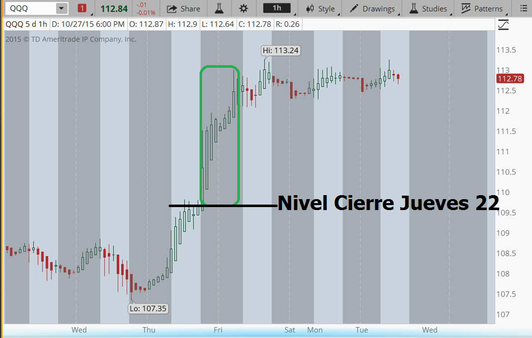 Ese día habló Draghi y junto con el recorte en China de tipos la tendencia alcista dominó todo el día. Pero nada más cerrar presentaban cuentas empresas de renombre como Microsoft (MSFT) +10.07%, Amazon (AMZN) +6.22% y Google (GOOG) +7.7%. El impacto en el Nasdaq y en concreto en el Etf QQQ fue de un vertiginoso subidón en After Hours, con lo cual el daño ya estaba hecho en la apertura del día siguiente para las situaciones comentadas anteriormente. Imagen de movimiento del precio: