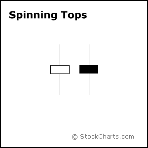 Candlesticks with a long upper shadow, long lower shadow and small real body are called spinning tops. One long shadow represents a reversal of sorts; spinning tops represent indecision. The small real body (whether hollow or filled) shows little movement from open to close, and the shadows indicate that both bulls and bears were active during the session. Even though the session opened and closed with little change, prices moved significantly higher and lower in the meantime. Neither buyers nor sellers could gain the upper hand and the result was a standoff. After a long advance or long white candlestick, a spinning top indicates weakness among the bulls and a potential change or interruption in trend. After a long decline or long black candlestick, a spinning top indicates weakness among the bears and a potential change or interruption in trend.