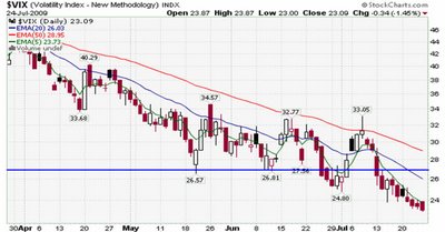 VIX: 23.09 - La tendencia bajista continua y la volatilidad sigue cayendo. El nivel de 20 está cada vez más cerca. Hay que recordar, cuando el VIX se movía en esos niveles, que por debajo de 20 entraríamos en una zona de excesiva confianza lo que predeciría la formación de un techo, por lo que dicho techo podría estar cerca.