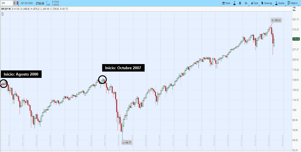 Pero se le puede dar una vuelta y pensar en meses y adaptarlo a la situación actual. Piensa en un mercado bajista, 2000 o 2008, y que comenzaras a invertir en el peor momento posible. Comienzas a invertir justo en el mes que se han conseguido los máximos anteriores a esas crisis.